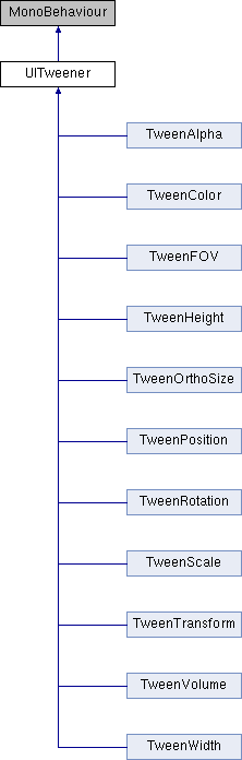Implemented in TweenVolume, TweenColor, TweenPosition, TweenAlpha, TweenOrthoSize, TweenHeight, TweenWidth, TweenFOV, TweenRotation, TweenScale, and TweenTransform.